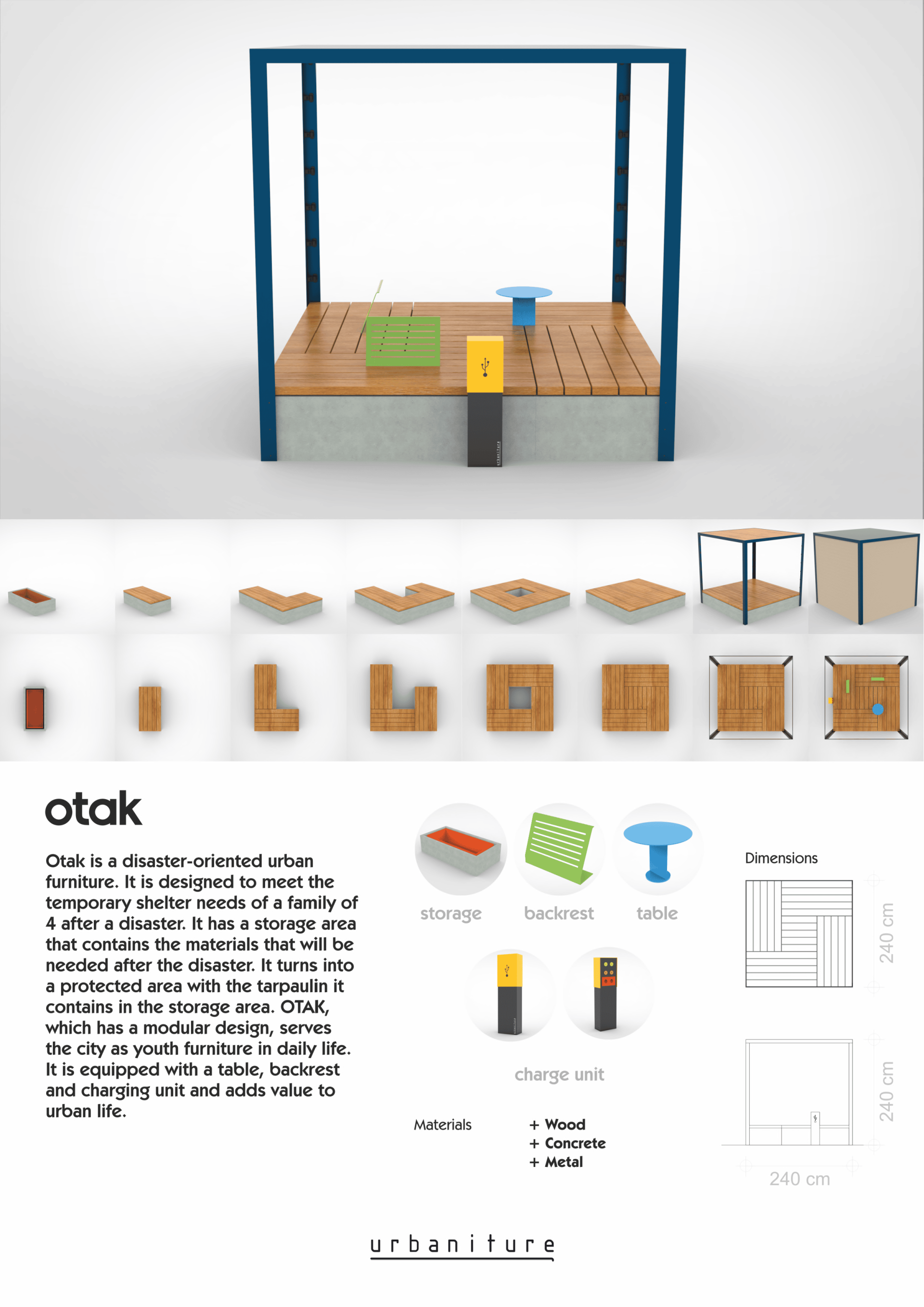 Otak is disaster-oriented urban furniture designed to meet the temporary shelter needs of a family of four after a disaster. It features a storage area containing essential materials for post-disaster situations. The included tarpaulin can be used to create a protected area. Otak's modular design allows it to serve as youth furniture in daily life. Equipped with a table, backrest, and charging unit, it adds significant value to urban living.